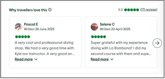 TripAdvisor provides social proof through traveler reviews, Pelago adds engaging storytelling, and Trip.com highlights booking convenience. Together, they reinforce La Bombona Diving’s reputation as a reliable choice for first‑time divers.
