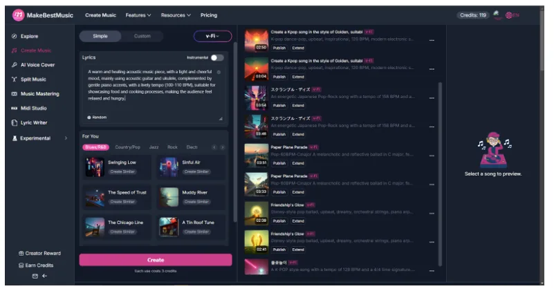 Simple Mode: In the Create Music section of MakeBestMusic, users can select Simple Mode, paste the prepared prompt into the Lyrics input box, and then click the Create button. MakeBestMusic will generate 2 different versions of the music within a few minutes. Each version varies slightly in instrument arrangement, rhythm changes, and arrangement details, providing creators with more options to choose the one that best fits the live stream atmosphere. The generated music is complete and highly professional. Users can quickly obtain usable works without any knowledge of music theory, arrangement, or recording.
