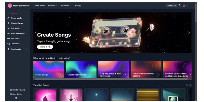 • Open MakeBestMusic and log in to your account. If you are a new user, you can register first and use the free trial quota provided by the platform. During the trial period, new users can experience MakeBestMusic’s powerful features, including creating music from scratch, generating vocal or instrumental-only versions, as well as AI cover songs and multi-track separation. After logging in, you will enter the main interface of MakeBestMusic, where all creation functions are clearly displayed in the navigation bar.