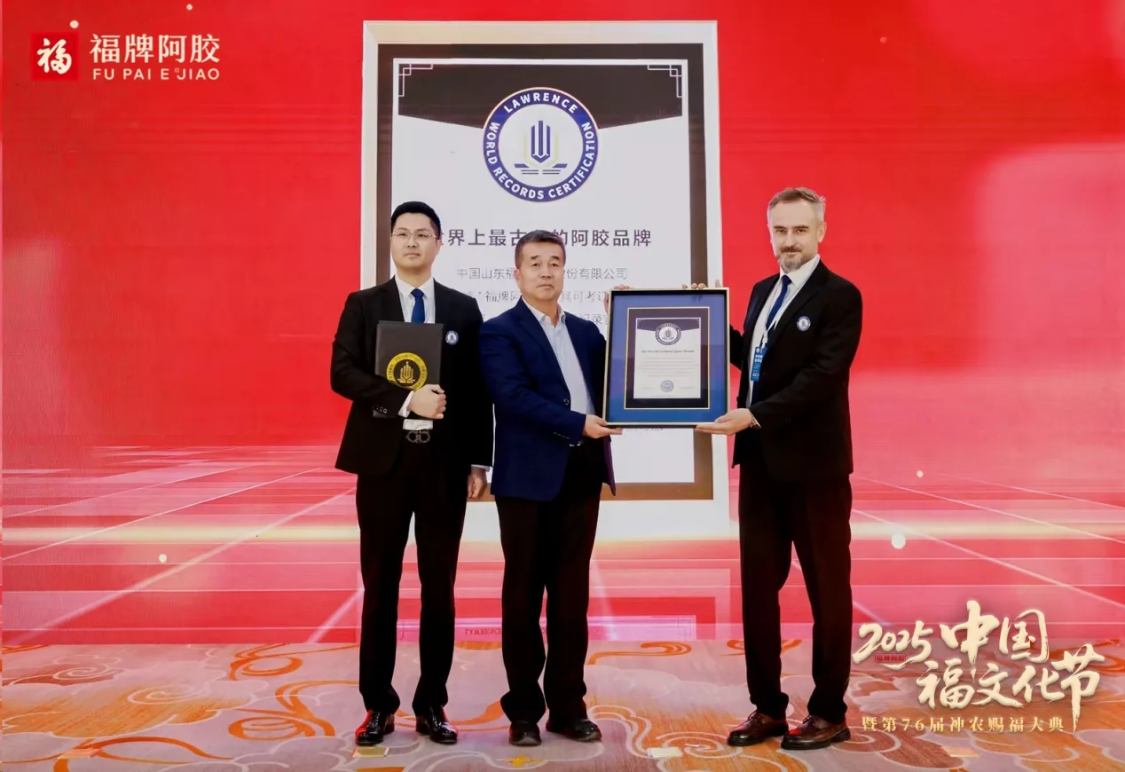 Jinan-On the Winter Solstice of December 21, 2025, in Dong’e Town, Shandong — the recognized birthplace of Ejiao — the awarding of a world record was seamlessly woven into an ancient annual ceremony. Mr. Aurelian Constantin, Certification Officer of Lawrence World Records, took to the stage to officially announce that Fu Pai Ejiao was certified as the “World’s Oldest Ejiao Brand”, with a documented history traceable to 1691. He then jointly presented the official certificate with Mr. Li Haitao, President of Lawrence World Records China, to Mr. Yang Fu’an — inheritor of the National Intangible Cultural Heritage, Party Committee Secretary, and Chairman of Fu Jiao Group.