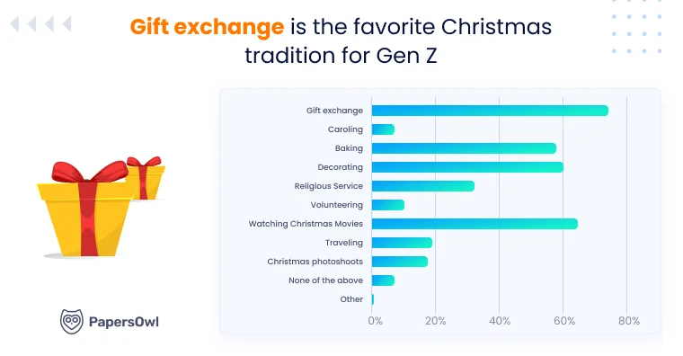 PapersOwl’s data shows strong support for low-tech rituals. Around 59% say baking is part of their Christmas. Sixty percent mention decorating. Sixty-two percent plan Christmas movie marathons.