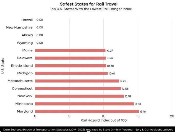 Between 2019 and 2023, Hawaii, New Hampshire, Alaska, and Wyoming achieved perfect safety records with a rail hazard score of 0/100 – meaning zero rail fatalities across all categories during this five-year period. These states represent the gold standard for rail safety in America.