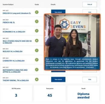“Our child was close to giving up on the IB,” said a parent of a student who improved from a predicted 28 to a final 35. “The tutors broke the subjects down and rebuilt their confidence, and the final result went far beyond what we expected.”