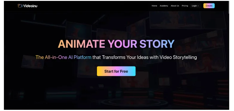 Videoinu is an AI video platform focused on turning ideas into story-driven videos. Its homepage highlights longer-form video creation, character consistency, creative style control, and AI voiceover.
