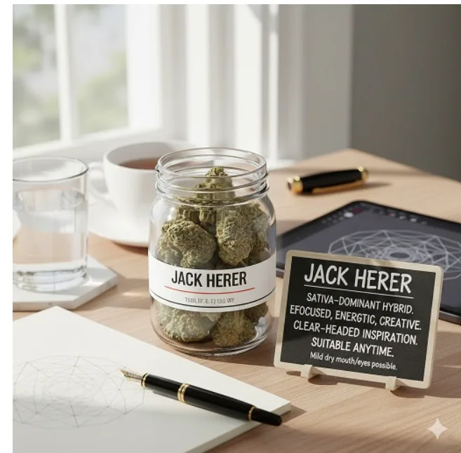 Some also mention mild side effects like dry mouth or dry eyes, but these are typical with most hemp strains. Overall, Jack Herer kush is considered a well-rounded strain suitable for different times of the day, especially when mental clarity or creative inspiration is desired.