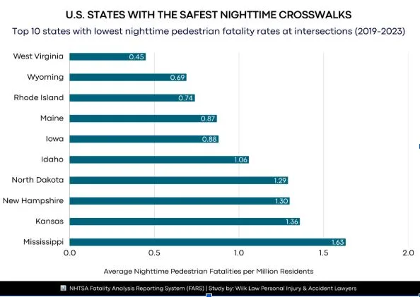 A new study byWilk Law Personal Injury & Accident Lawyers analyzed nighttime pedestrian fatality data at intersections from the CDAN Fatality Analysis Reporting System (FARS) across all 50 U.S. states from 2019 to 2023. The study measured Average Nighttime Pedestrian Fatalities at Intersections per Million Residents, with lower numbers indicating a lower likelihood of fatal incidents involving pedestrians after dark.