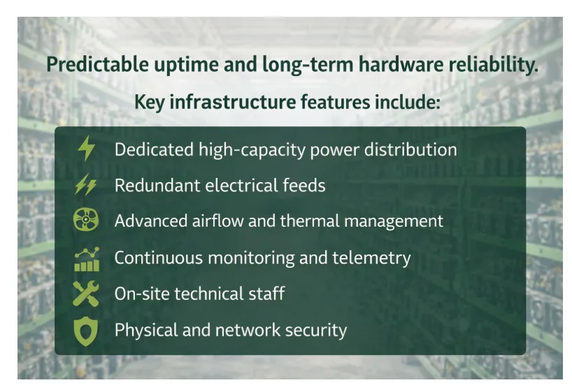These features allow the site to host everything from single-unit deployments to multi-megawatt installations, supporting a wide range of professional computing applications.Fully Managed Hosting Model