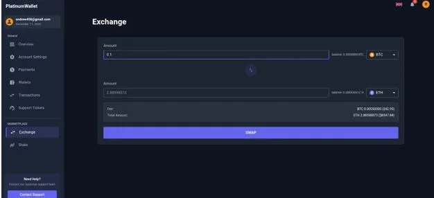 Some internal wallets are dedicated to a single coin; others host a range of tokens that share a standard (for example, ERC-20 tokens in the Ethereum Wallet). The platform also provides fiat accounts — USD Wallet and EUR Wallet — where traditional-currency deposits are stored before being exchanged via the internal swap feature.