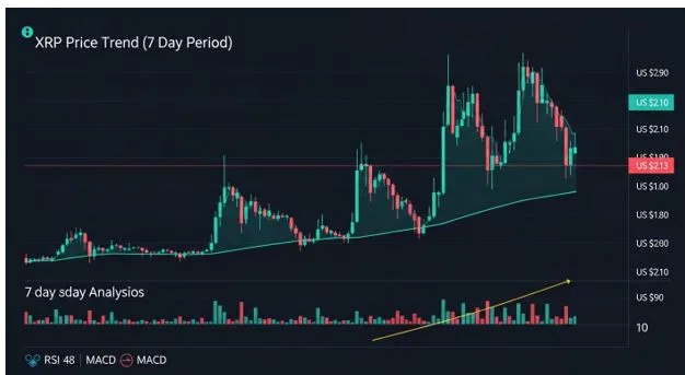 A 7-day XRP (clean) performance analytical graph. It rises and falls between US $2.10 and US $2.90 and can be seen that the buying activity is high on November 1 and November 3. The RSI indicators and MACD are indicated below and they are a reflection of the momentum changes.