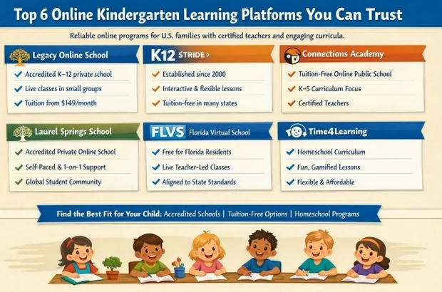 Choosing the best online kindergarten program depends on your child’s needs and your family’s preferences. These top six platforms each bring certified teachers, interactive lessons, and strong curricula in different ways. Legacy Online School, Connections Academy, K12-powered programs, and FLVS offer fully accredited, teacher-led kindergarten courses (some free, some tuition-based) that mirror a traditional classroom online. Laurel Springs provides a private-school option with personalized support, while Time4Learning offers a flexible homeschool curriculum ideal for self-motivated families. By comparing accreditation, teaching approach, schedule flexibility and cost, U.S. parents can find a trustworthy online kindergarten that helps their child build a solid foundation for learning.