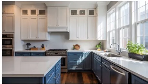 - Two-tone design: Light upper cabinets and darker bottoms provide a fashionable contrast.