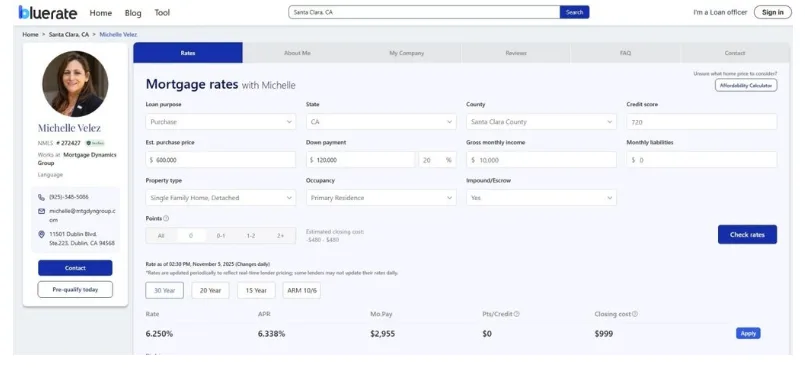 Bluerate performs strict checks to ensure the professionals on their platform have a valid license and a clean record on NMLS Consumer Access. You can view their biography, the languages they speak, their company affiliation, and their past highlights. This level of detail lets you vet the person handling your finances before you ever send a message.