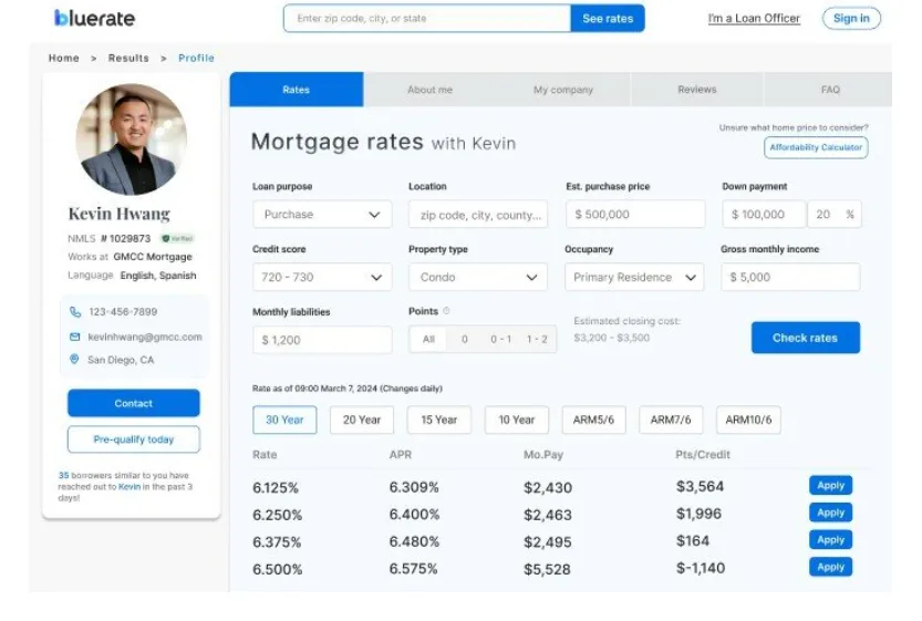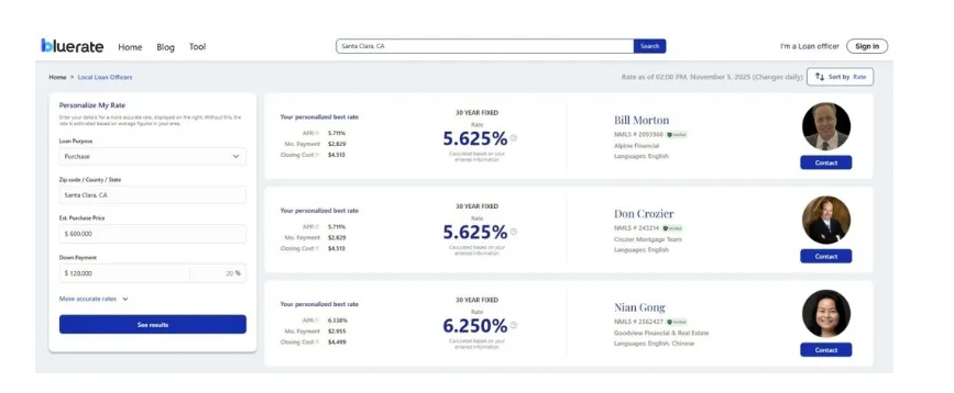 On Bluerate, you can search for LOs by location or loan type. The results allow you to compare them side-by-side. You can see their specific expertise, which state they are licensed in, and their verified profile details. Instead of being assigned a random call-center agent, you get to choose a professional who knows your local market.