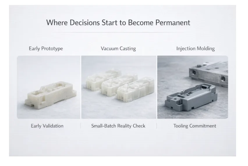 Injection molding introduces finality. Geometry is locked. Assumptions about assembly and use become fixed. For teams still learning how their product behaves outside controlled tests, that level of commitment can feel premature, even if the destination is clear.